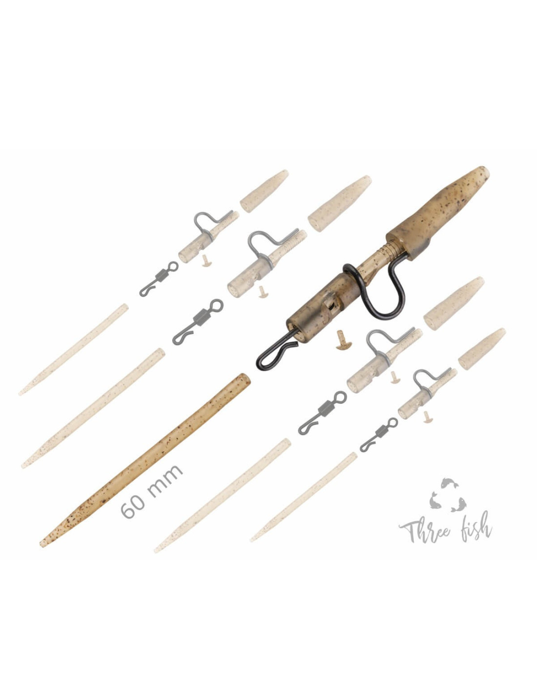 Contenido del paquete: 5 fundas de goma para la cola, 5 clips resistentes, 5 pasadores de bloqueo para asegurar el emerillón, 5 emerillones de cambio rápido con acabado mate premium, 5 anillas antienredos de 60 mm para evitar que se enrede el anzuelo.