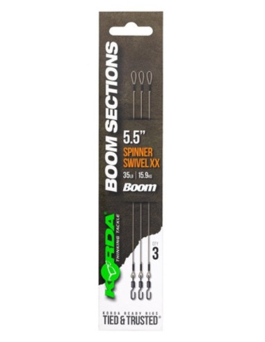 El Korda Booms Spinner Giratorio XX se entrega en un paquete de 3 unidades y está disponible en varias longitudes para satisfacer diferentes necesidades. Estos booms tienen un extremo con un lazo, lo que permite conectarlos fácilmente a tu línea principal. Fabricados con material Boom duradero de 35 lb, están diseñados para tener una larga duración. Además, cuentan con el XX Spinner Giratorio integrado, que asegura una rotación suave y reduce la resistencia durante la captura de peces.
