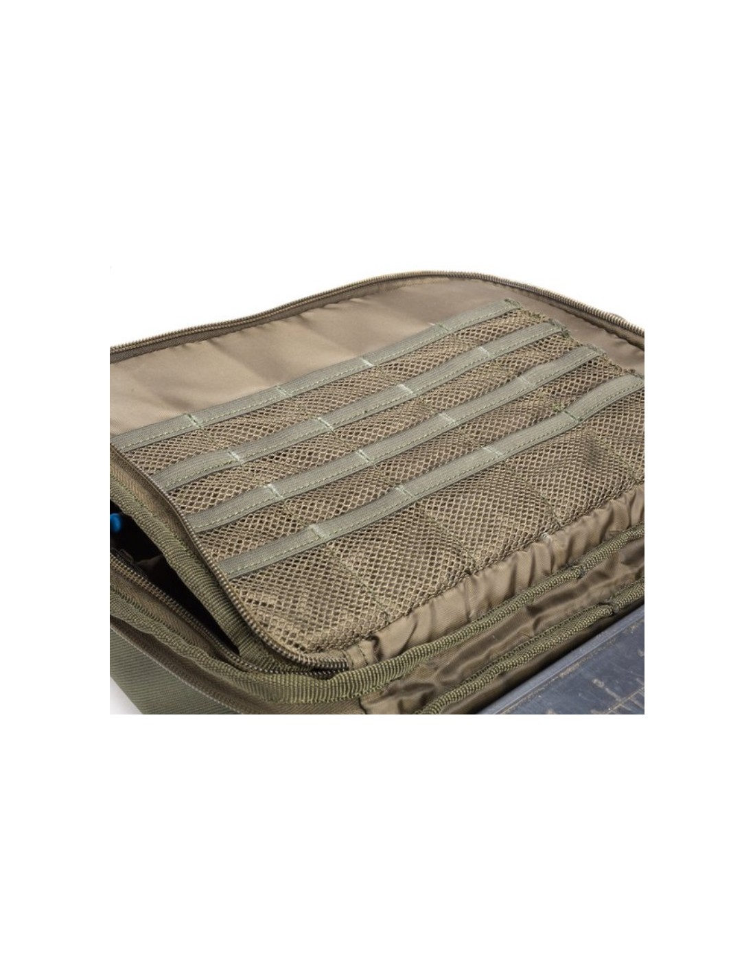 Almacenamiento de aparatos de apertura central, que sostiene una caja de aparatos Logix Box mediana, con cierre de cremallera en el compartimento opuesto, divisor central con bolsillo de malla completa y 15 bolsillos de malla para Nash TT.