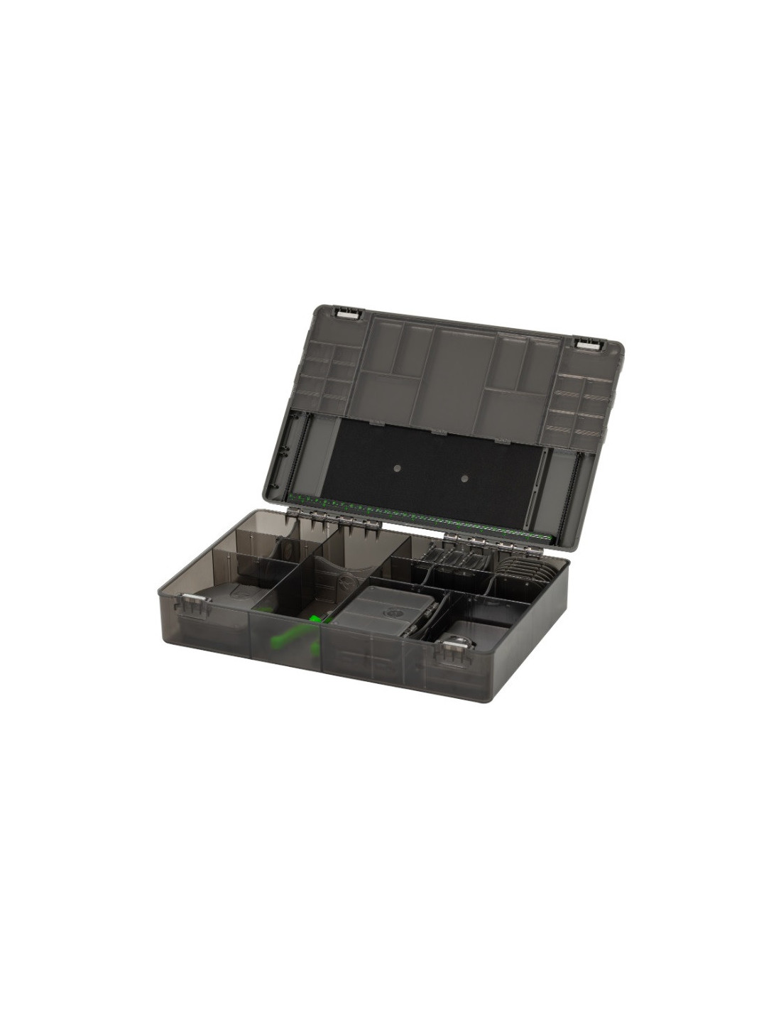 Esta versátil caja de aparejos se adapta perfectamente a las necesidades de cualquier usuario, con 25 compartimentos individuales integrados en la tapa. Cada sección cuenta con una tapa transparente con bisagras que no solo guarda tus pertenencias de forma segura, sino que también te permite ver el contenido de un vistazo. Desde pivotes hasta tubos termorretráctiles y desde kickers hasta Heli-Safes, estos compartimentos organizan de manera eficiente todos sus artículos pequeños.