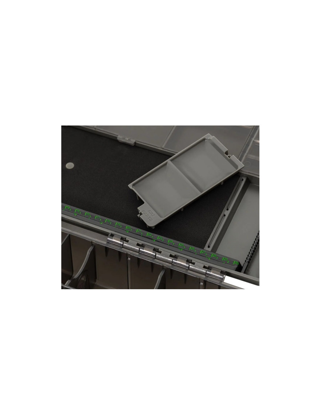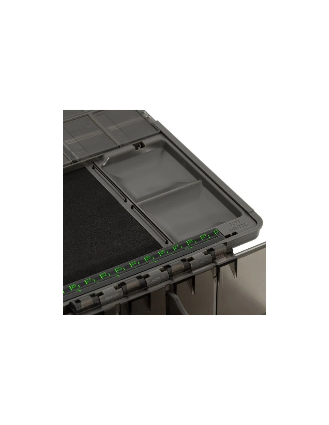 La tapa también contiene una tabla de aparejo real, como en un Rig Safe, completa con un soporte de anzuelo ranurado y mecanizado. La plataforma de montaje puede almacenar hasta 56 montajes preatados y viene con 30 pasadores simples y 20 dobles para asegurarlos de forma segura. El ingenio de esta caja de aparejos no se detiene ahí: la tabla de aparejo contiene una innovadora barra de aparejo que almacena sus Spinner Booms sin necesidad de un gancho. Esto es algo que a Damian Clarke se le ocurrió para usar en su propio Rig Safe, pero ahora se ha desarrollado una idea similar para la Large Tackle Box. Para completar el Rig Board hay una regla de alta visibilidad que le ayudará a crear el aparejo o la pluma de longitud perfecta.