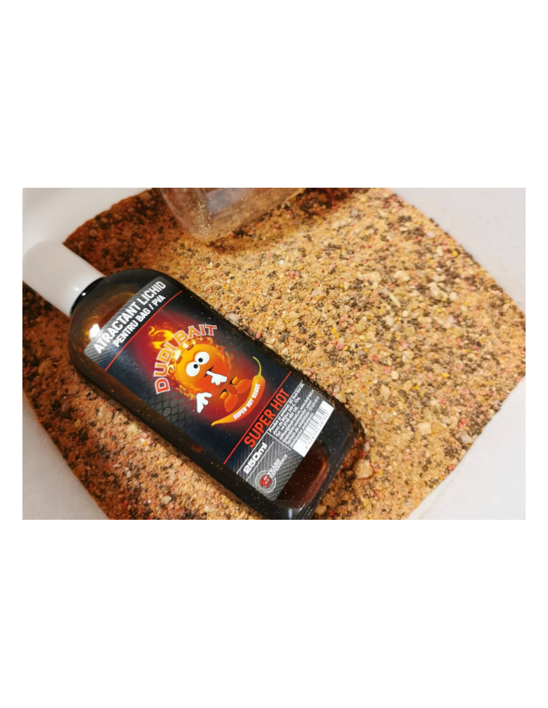 El Bag Pack "Super Hot" contiene: – 2,5 kg de mezcla sólida Bag Mix "Super Hot" + 1 botella de 250 ml de atrayente líquido "Super Hot" para bolsas de PVA sólido Dudi Bait