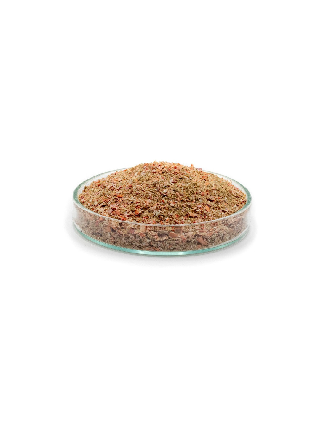Harina granulada (90% de partículas de alrededor o < 1 mm), color: rojo, naranja y blanco, sabor y olor típicos del cangrejo de río tostado.