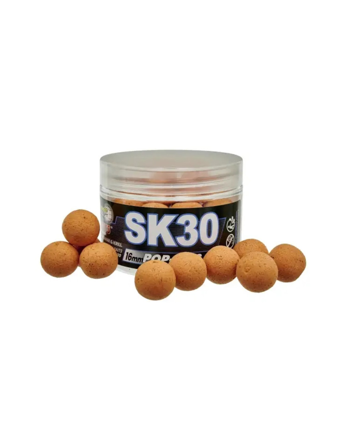 Pop Ups Flotantes de 16 milímetros de la marca Starbaits modelo SK 30, especial para la pesca de carpfishing.