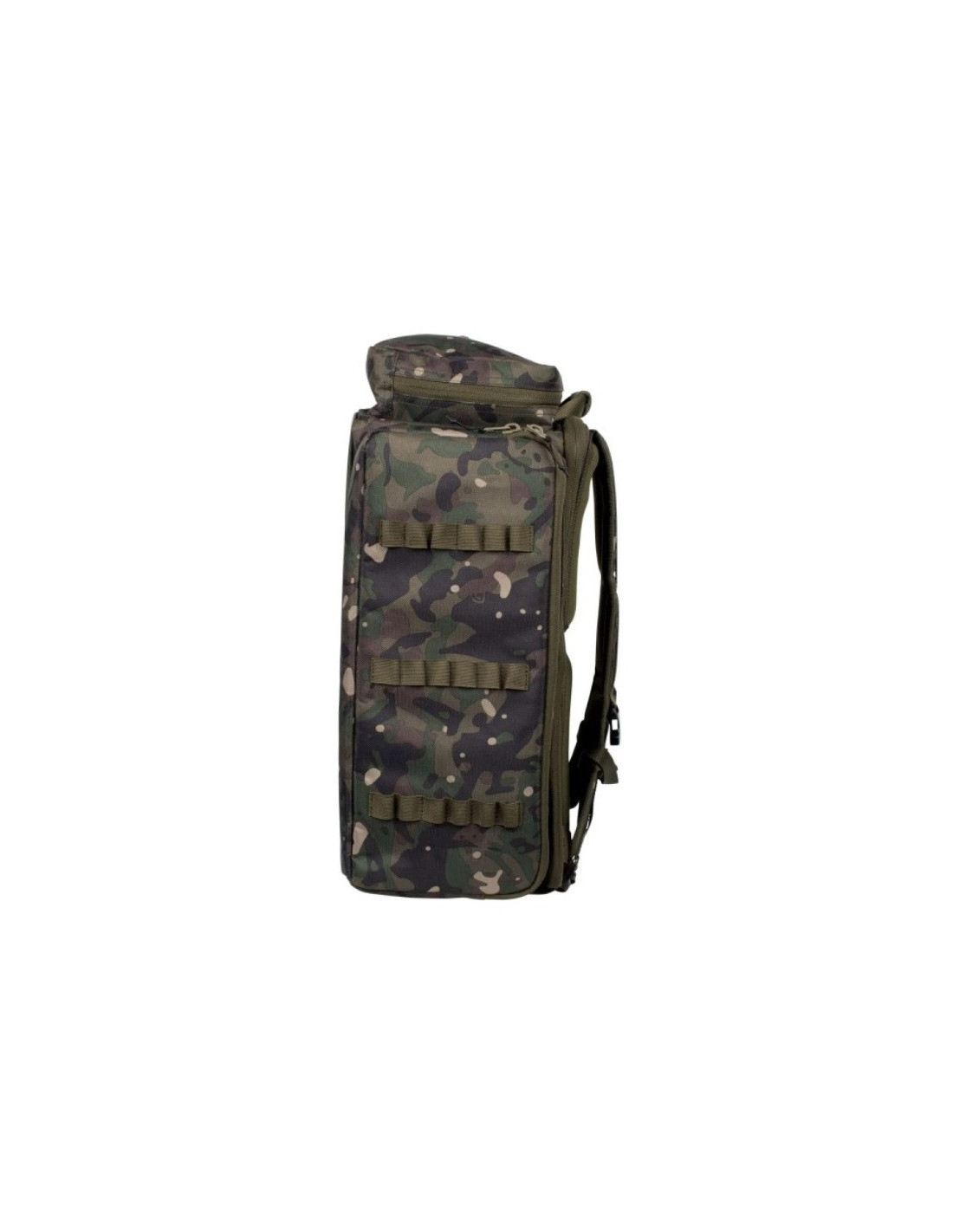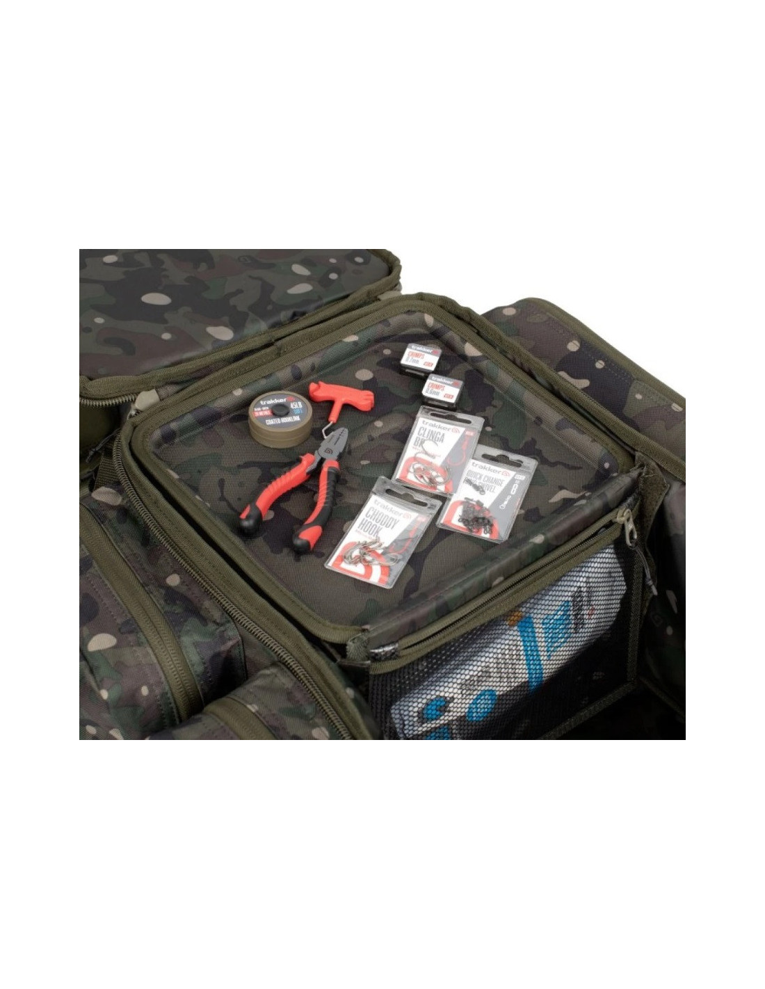 El diseño estrecho de la mochila permite un fácil almacenamiento debajo de la cama de pesca, y el acceso a todas las áreas clave es extremadamente fácil, lo cual es ideal durante la pesca con carrito. El compartimento principal de la mochila ofrece un espacio enorme para almacenamiento, y un bolsillo adicional con cremallera permite organizar el equipo necesario. El bolsillo lateral exterior de tamaño completo con forro interno protege las alarmas y barras de zumbido, mientras que los soportes elásticos en el exterior permiten almacenar soportes de diferentes tamaños.