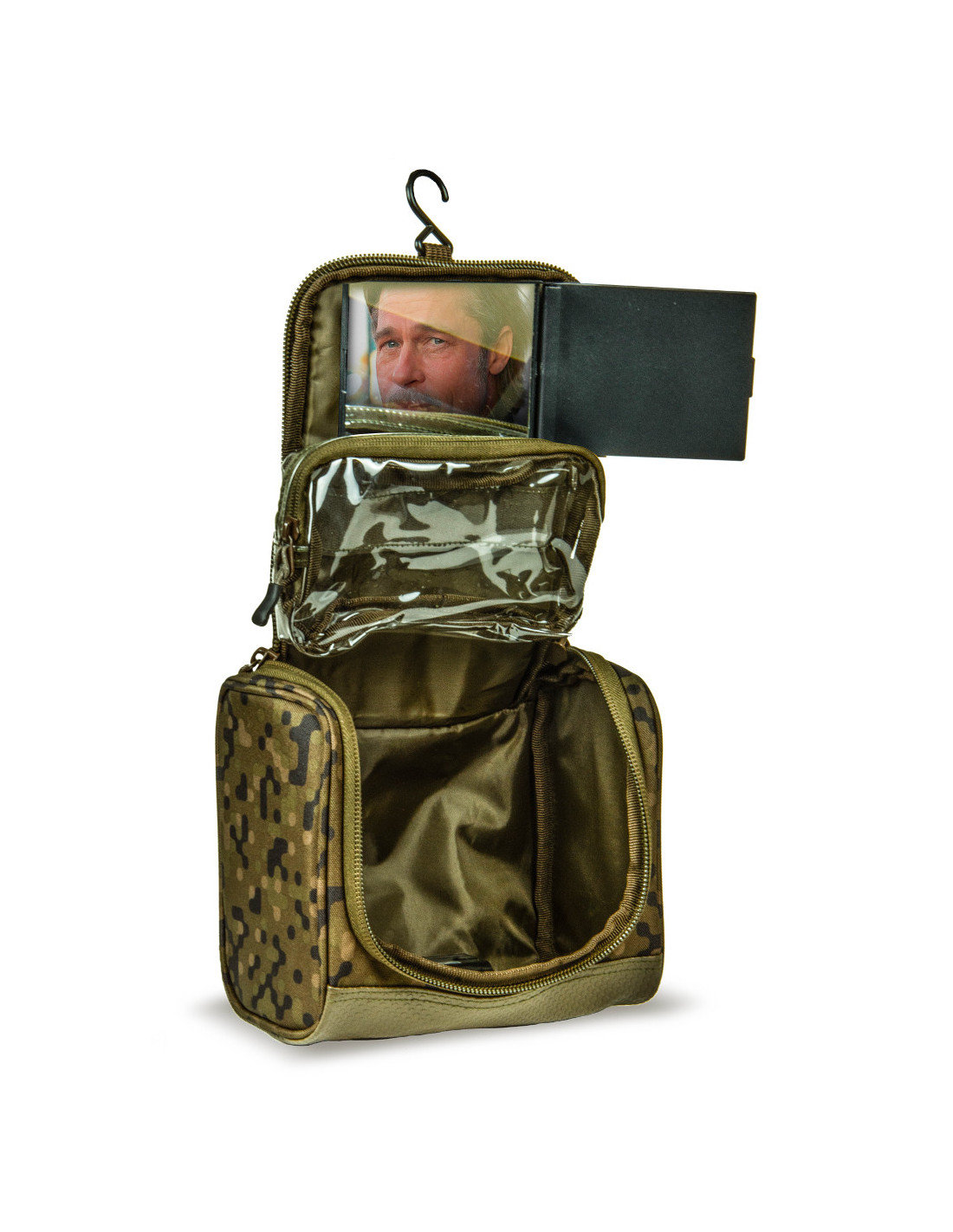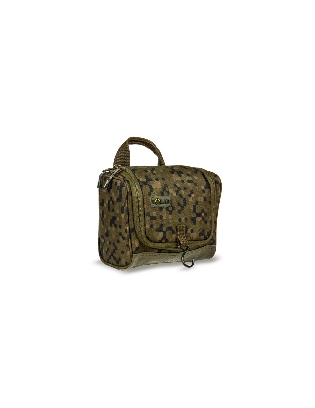 El neceser SP C-Tech ofrece un almacenamiento fantástico para tus artículos de aseo y se abre para dar paso a una estación de lavado que puedes colgar de un árbol, un vivac o un poste. La tapa con cremallera contiene un espejo, un compartimento impermeable para esponja, franela o pasta de dientes y un amplio compartimento principal para tus botellas, etc., e incluso un rollo de papel higiénico. Además, está recubierto de SolarCam, el camuflaje digital de Solar.