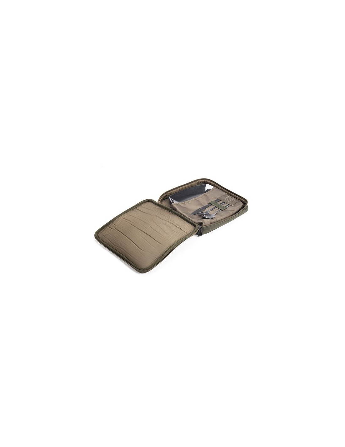Cuenta con acceso de cremallera de tres lados para revelar bolsillos que contienen un plato negro resistente al calor, cuchillo de acero inoxidable negro y tenedor y cuchara. Completo con un bolsillo de malla con cremallera en la parte inferior de la tapa para bolsitas y condimentos.