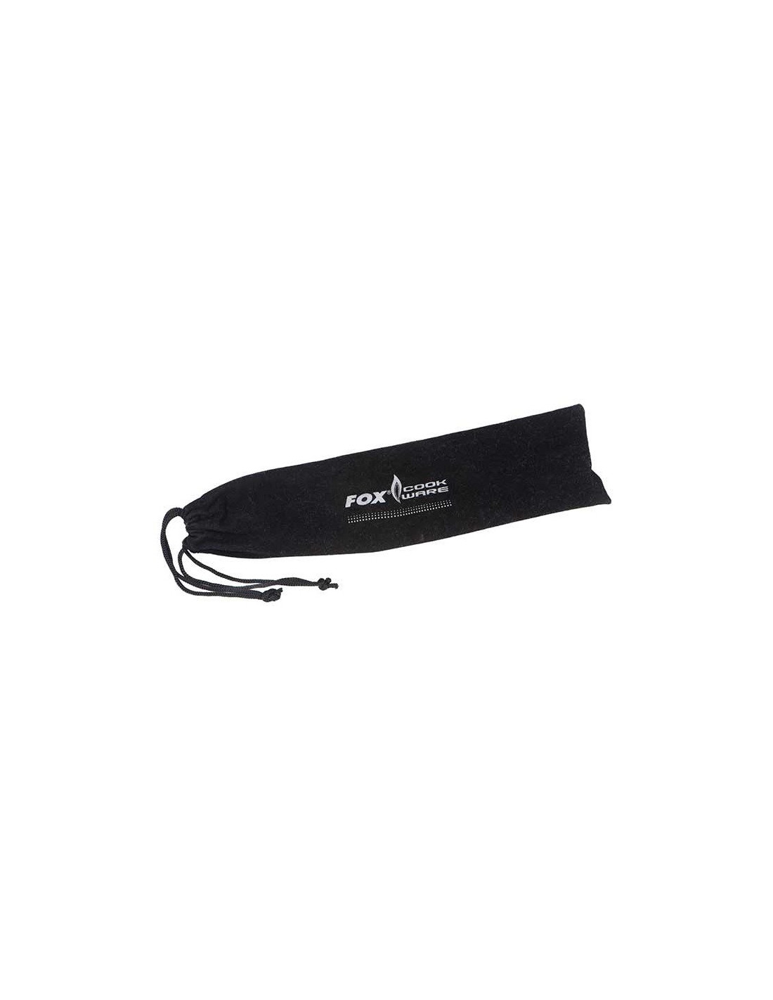 Juego de cubiertos de acero inoxidable negro en una bolsa con cordón para su almacenamiento.