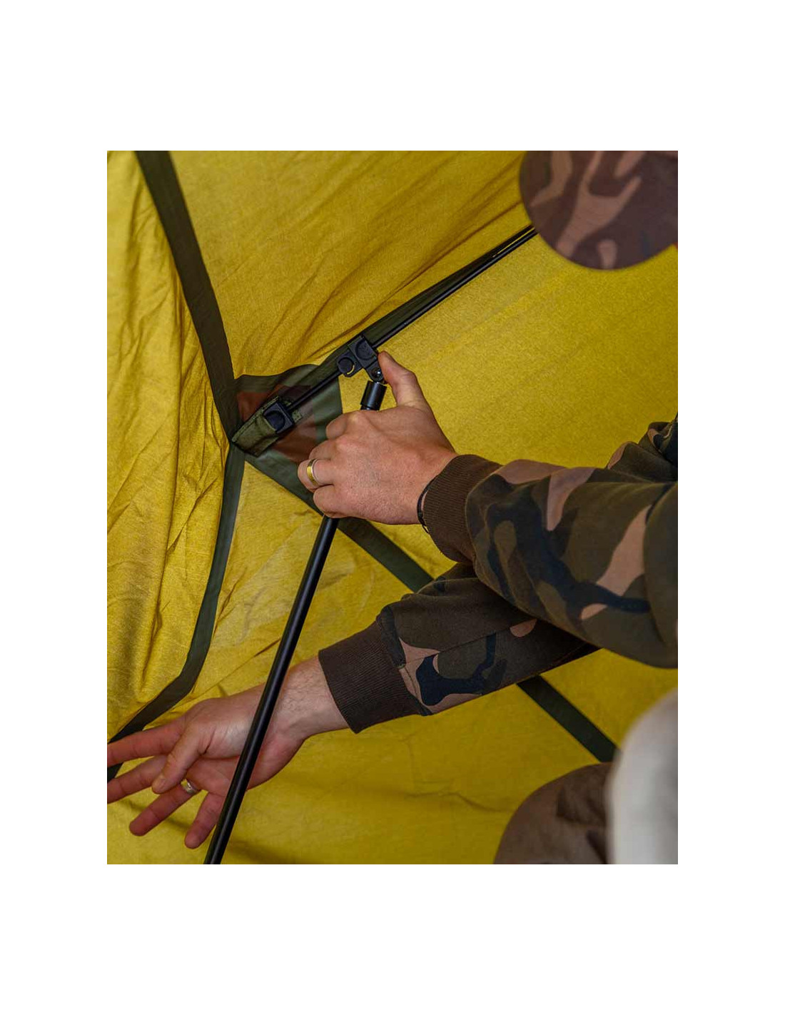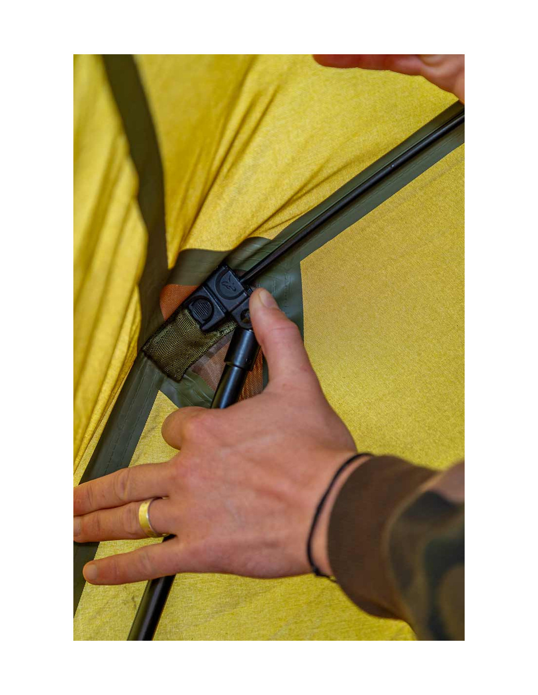 Los postes están unidos a los 'Quick Clips' y estos simplemente se deslizan por las costillas y se enganchan en su lugar en las molduras de enganche hembra en cada extremo de las radios.