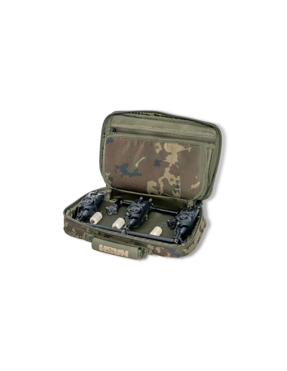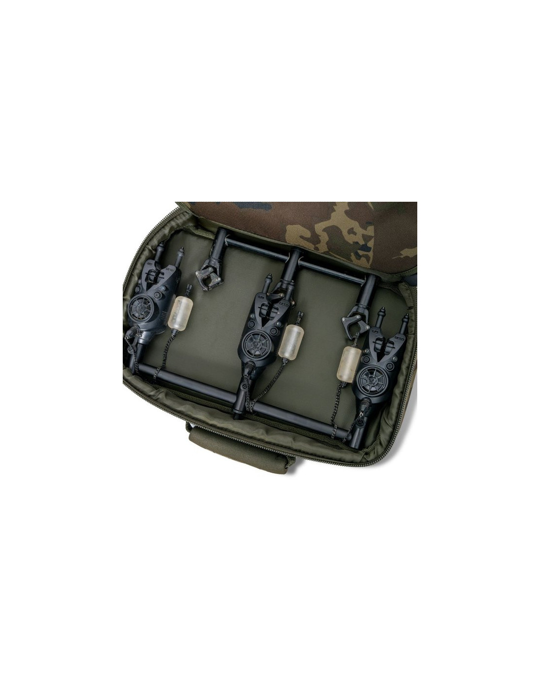 Diseñado para transportar y proteger 2-3 barras de alarmas para cañas, con alarmas y soportes traseros instalados.