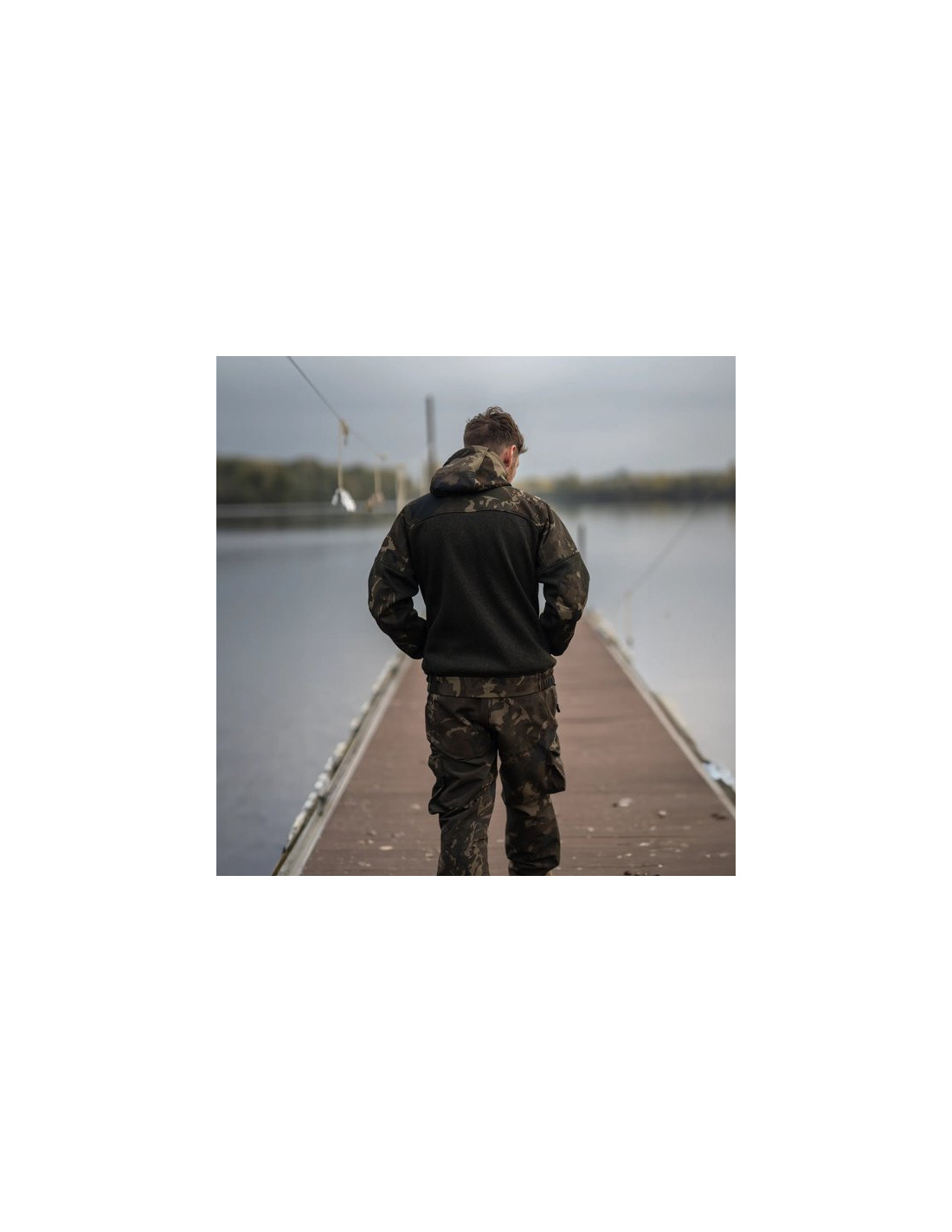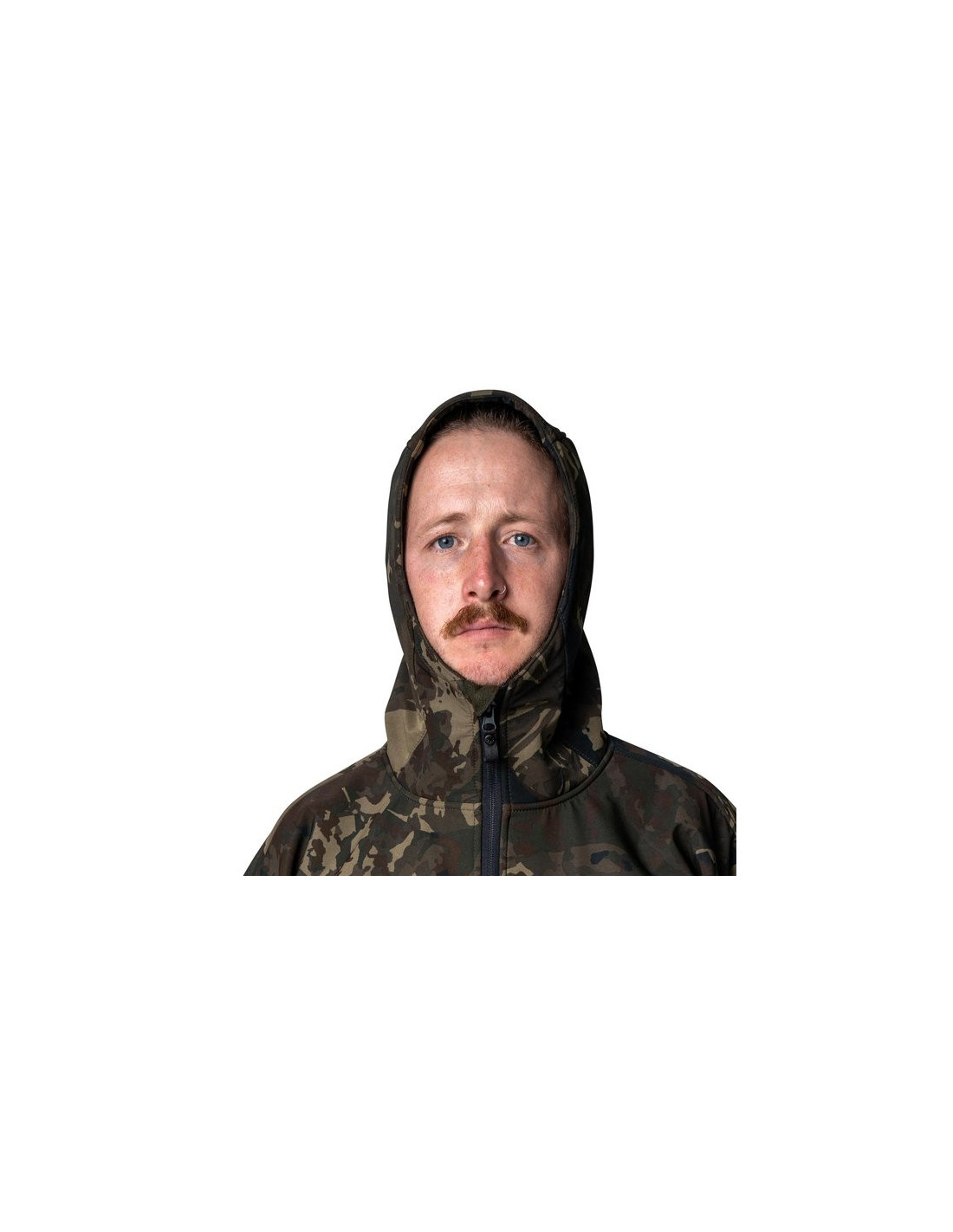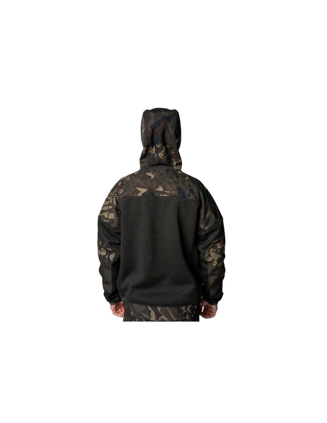 Capucha, hombros y coderas con ribete de camuflaje.